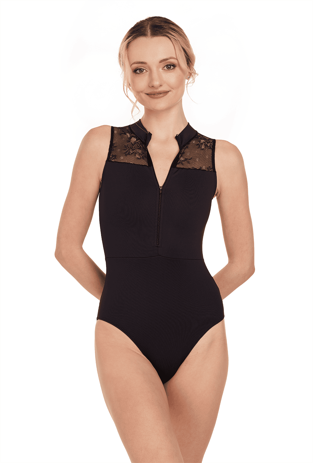 The mix of materials makes this leotard a modern choice with gorgeous detailing including a V-back lace panel and front zip opening