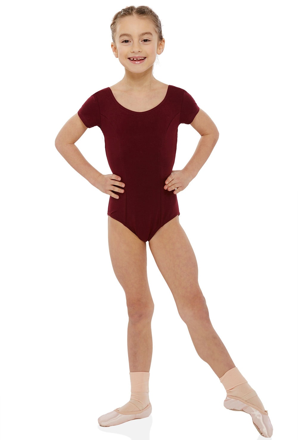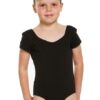 Children’s leotard with short sleeves and front princess seams. Features flattering sweetheart neck, low V-shaped back and full front lining. 90% cotton 10% lycra.