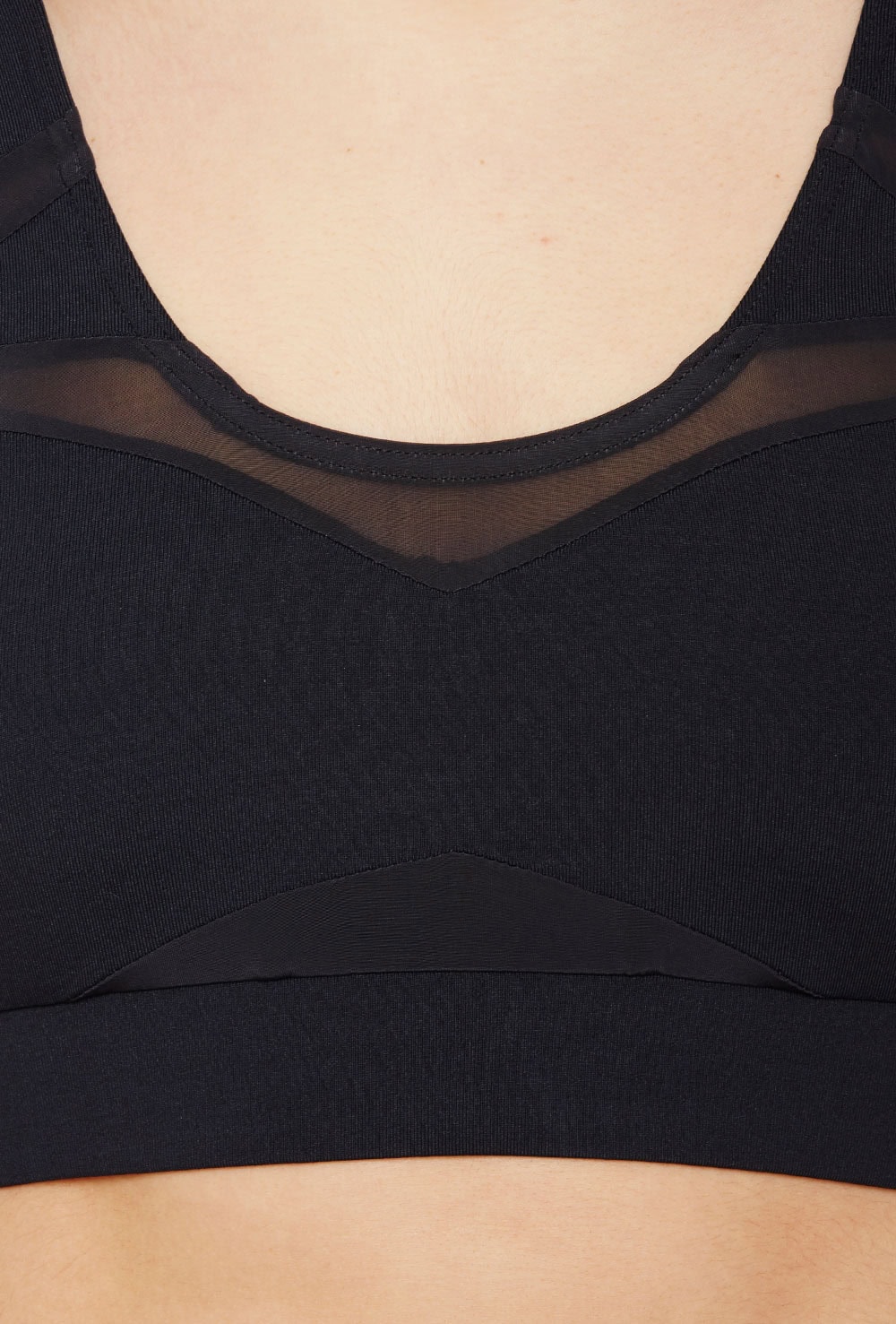 Halter neck crop top with mesh inserts and wide back aperture with clasp fastening. 92% tactel nylon 8% lycra spandex.