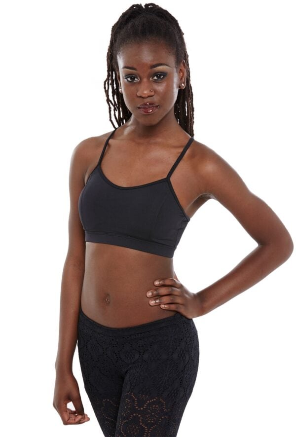 Camisole bra top with double stitched front princess seams and X-over back straps. Features modesty lining with removable pre-formed cups. 92% polymeryl 8% elastane.
