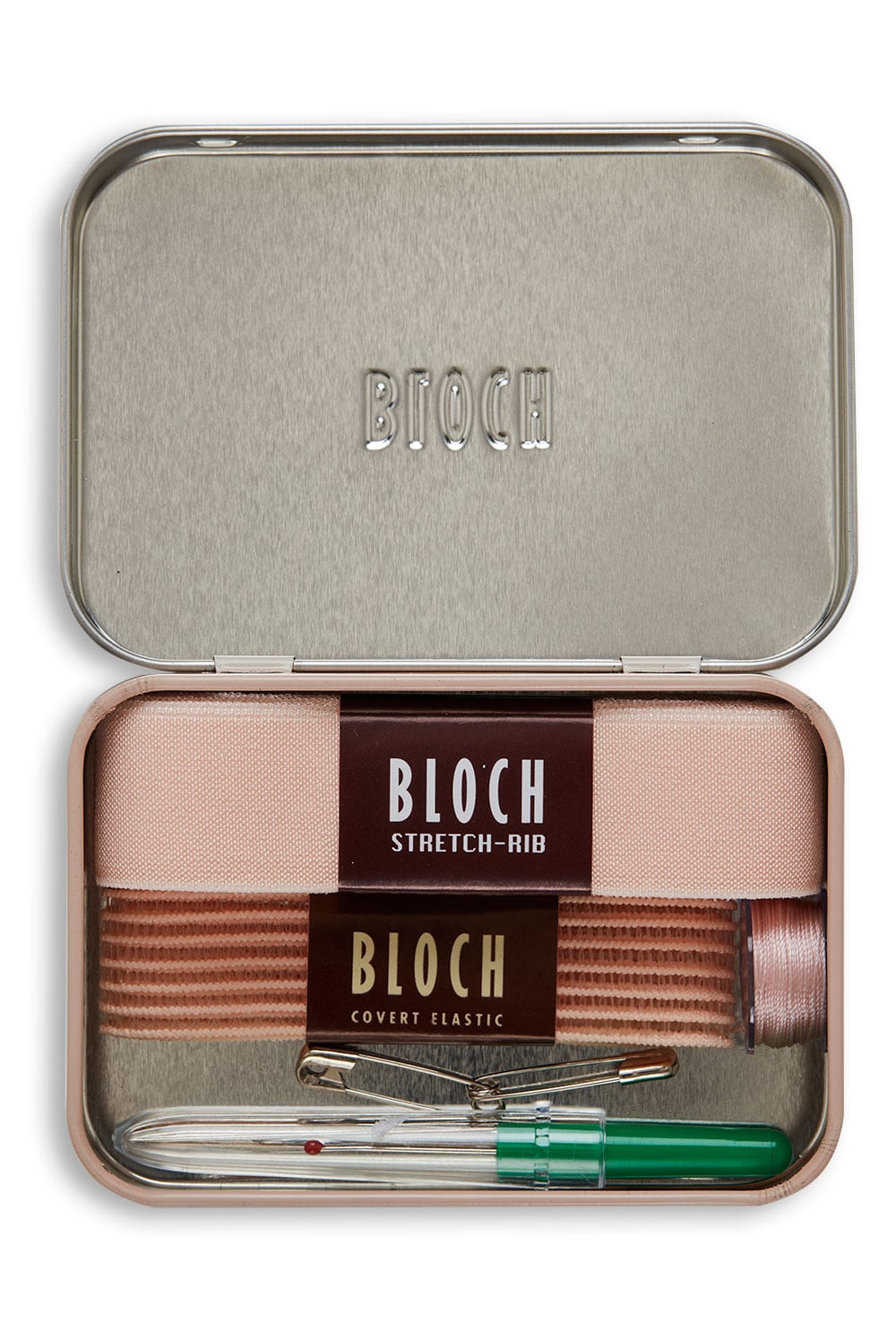 Pointe shoe ribbon and elastic sewing kit in a handy little tin.