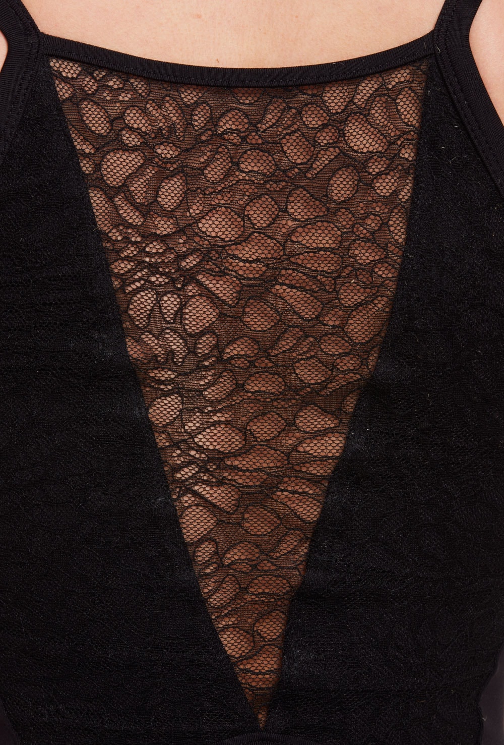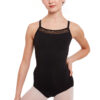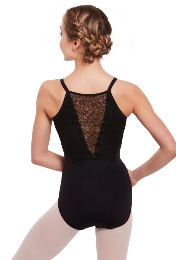 Camisole leotard with textured lace yoke and overlaid back with V-insert. Features bra modesty lining. 90% nylon 10% spandex.