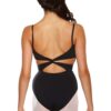 Camisole leotard with under bust empire seam and twisted X-strap open back. Features bra modesty lining. 78% meryl nylon 22% spandex.