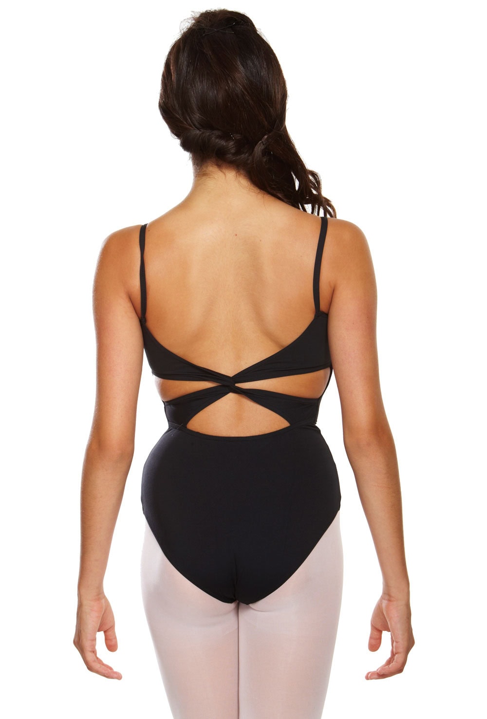 Camisole leotard with empire seam and twisted X-strap back.