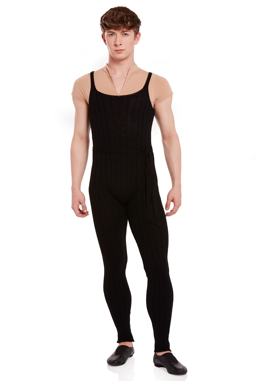 Unisex chunky rib warm-up romper with wide straps and full length legs. Knitted with seamless knitting technology for a seam free bodice. Come complete with a loose self tie knitted belt. 100% acrylic.